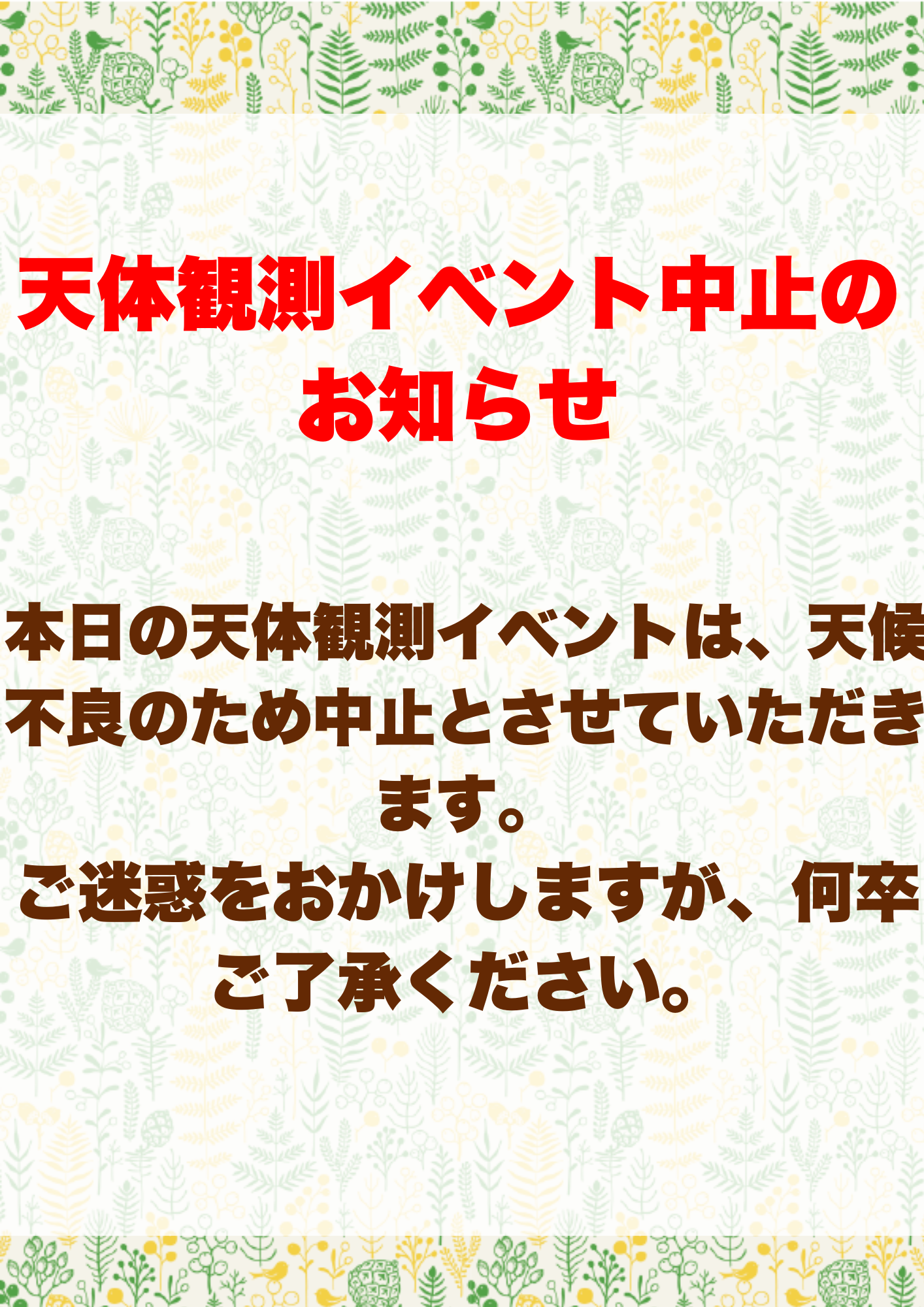 9/20(土)19:00~21:00に予定していた天体観測イベントは、天候不良のため中止とさせていただきます。