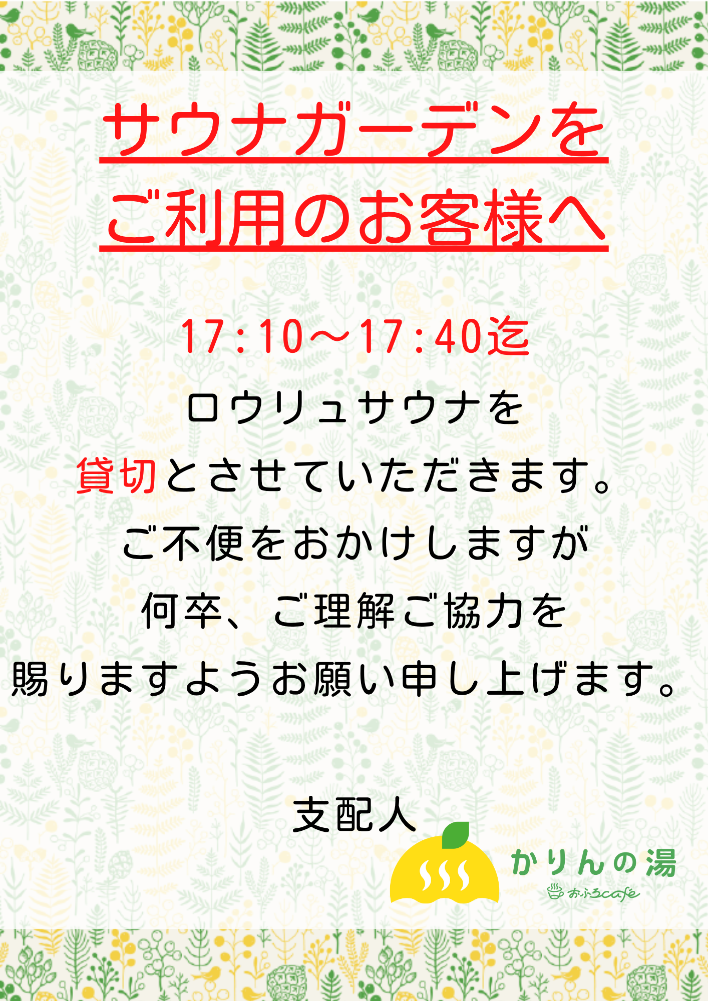 【10/21(火)サウナガーデンロウリュサウナ貸切のお知らせ】