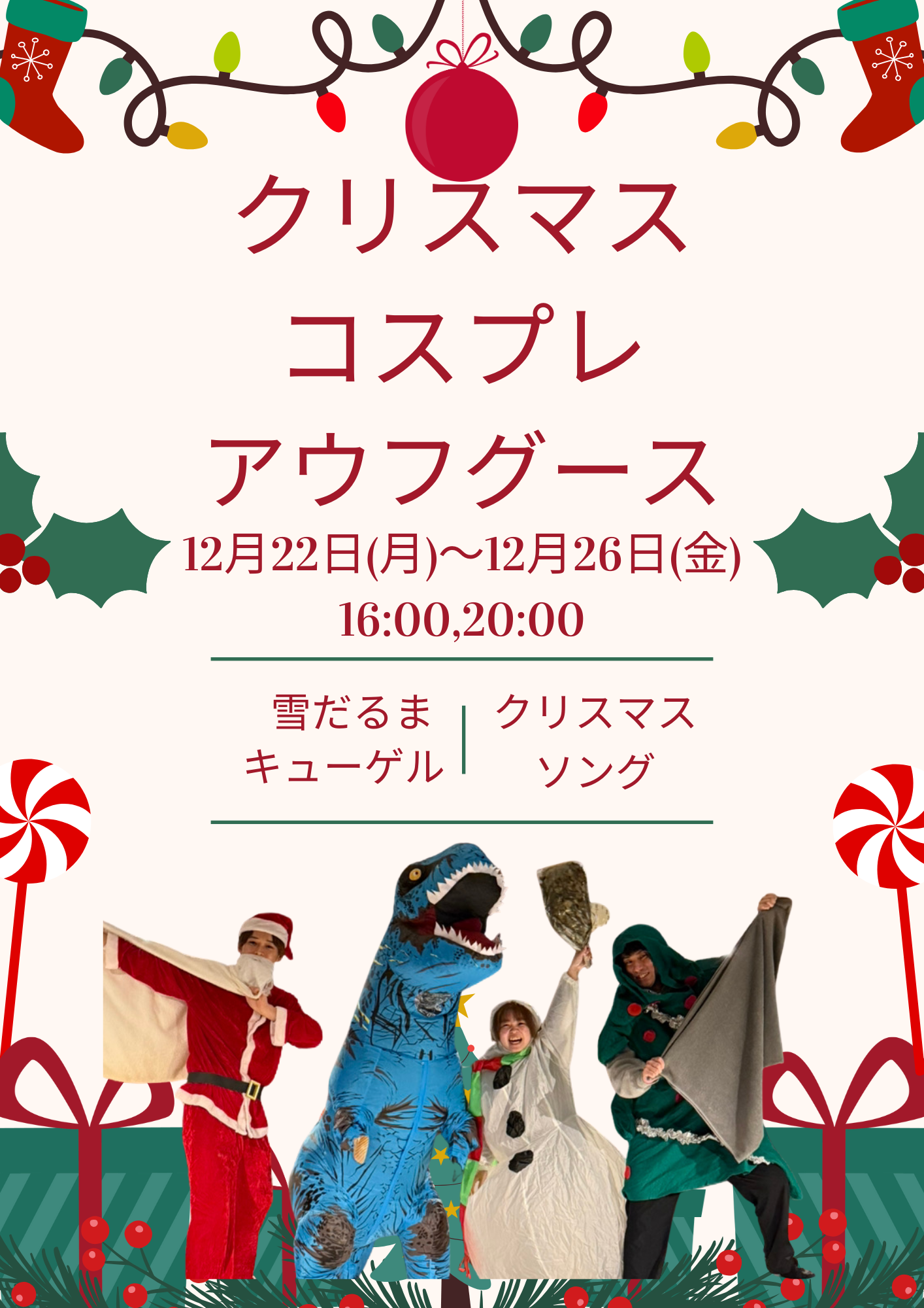 今回は、クリスマスのコスプレをして、雪だるまのキューゲルを使った特別なアウフグースをお楽しみいただけます。無料でご参加いただけるこのイベントは、おふろcaféかりんの湯のアウフギーサーからの心温まるクリスマスプレゼントです🎁
