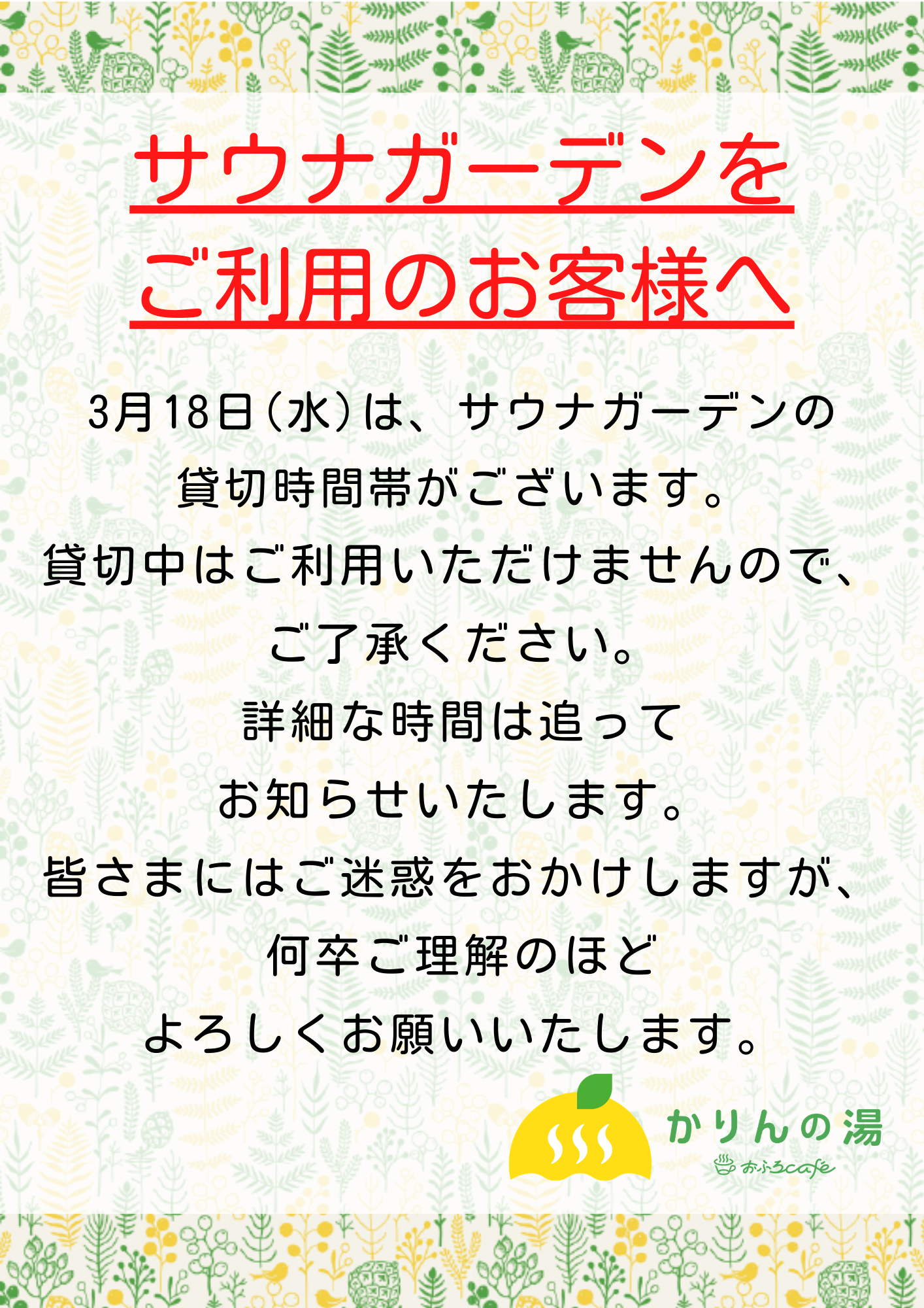 【重要】3/18(水)サウナガーデン貸切のご案内