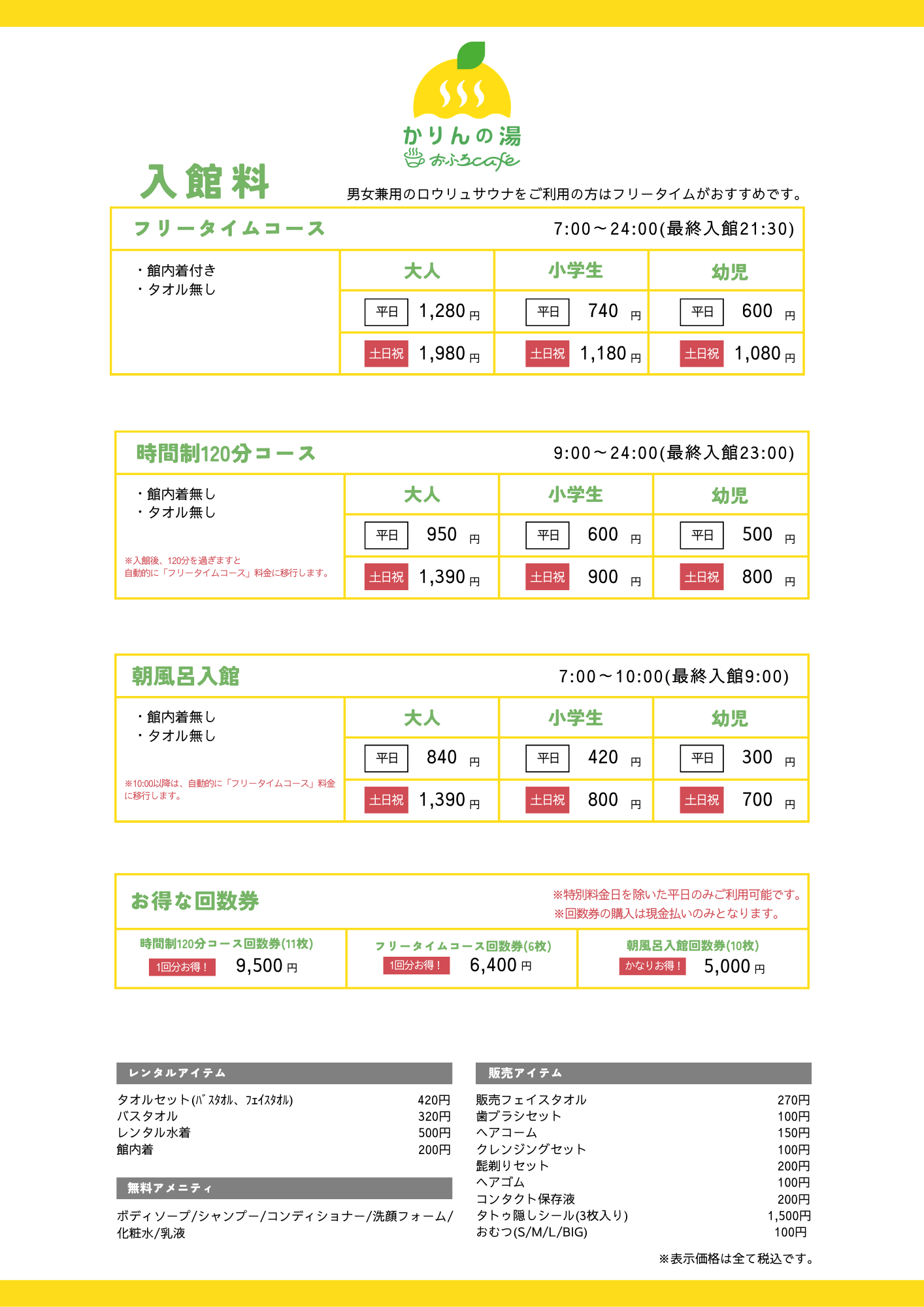 朝風呂入館の場合、10:00以降はフリータイム料金へ移行(従来の「10:00以降は120分コース加算」の段階を廃止)