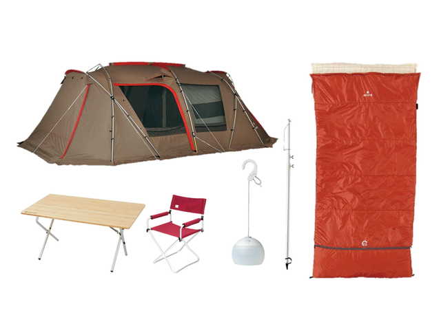 設営済みの大型テントとタープに加え、テーブルやチェア、シュラフにカトラリー類も全部そろった完全手ぶらプランです。季節に合わせた装備(寝袋・暖房/冷房装備)をご用意いたします。