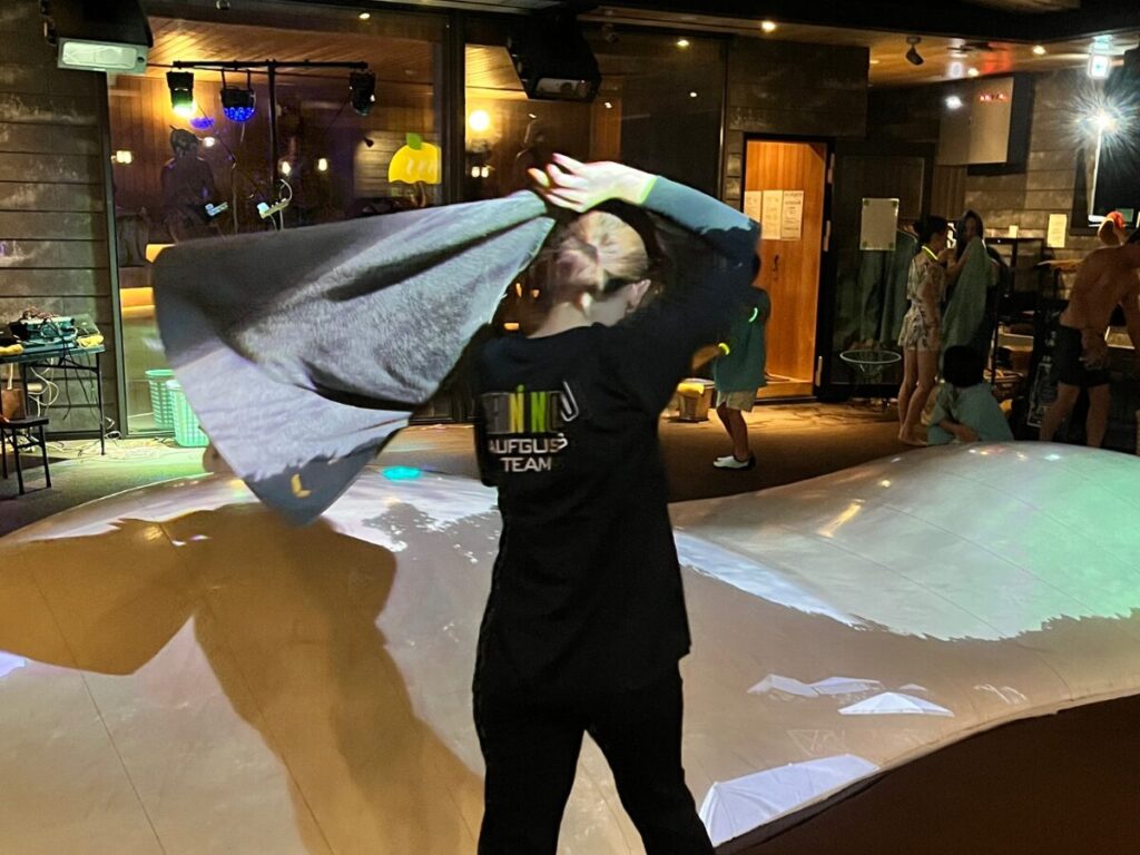 おふろcafé かりんの湯では、プロの熱波師が演出するアウフグースを毎日開催しています。プログラムに合わせたアロマ水をストーブに注いで蒸気を立ち上げ、パワフルなタオルワークで熱波と香りを届けます。深部体温をじわりと高め、サウナ→水風呂→外気浴のリズムで自律神経の切り替えを促します。サウナガーデンは男女共用サウナとなっており、初めての方にも安心。