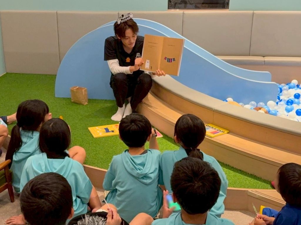 会場は、おふろcaféかりんの湯のキッズルーム。まずは、館内スタッフ「たかひとおにいさん」による絵本の読み聞かせからスタートします。クリスマスシーズンにぴったりの一冊や、読み終わったあとに親子でお話したくなるような物語を選び、子どもたちを“物語の世界”へと連れていきます。おふろ上がりで少し眠くなってきた時間帯に、やさしい声で物語を聴くひとときは、子どもにとっても心地よい「おやすみ前の時間」になりそうです。